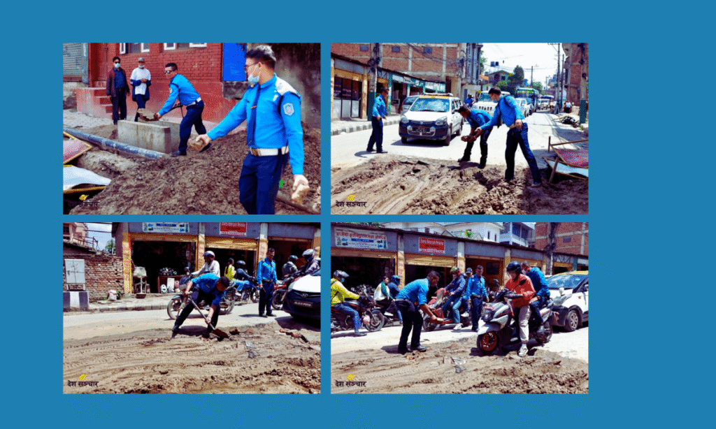 In an unusual yet increasingly common sight across the capital, Traffic Police Turn Road Workers in Kathmandu Valley whose primary duty is to manage traffic flow and ensure road safety have taken on an unexpected role repairing damaged roads.